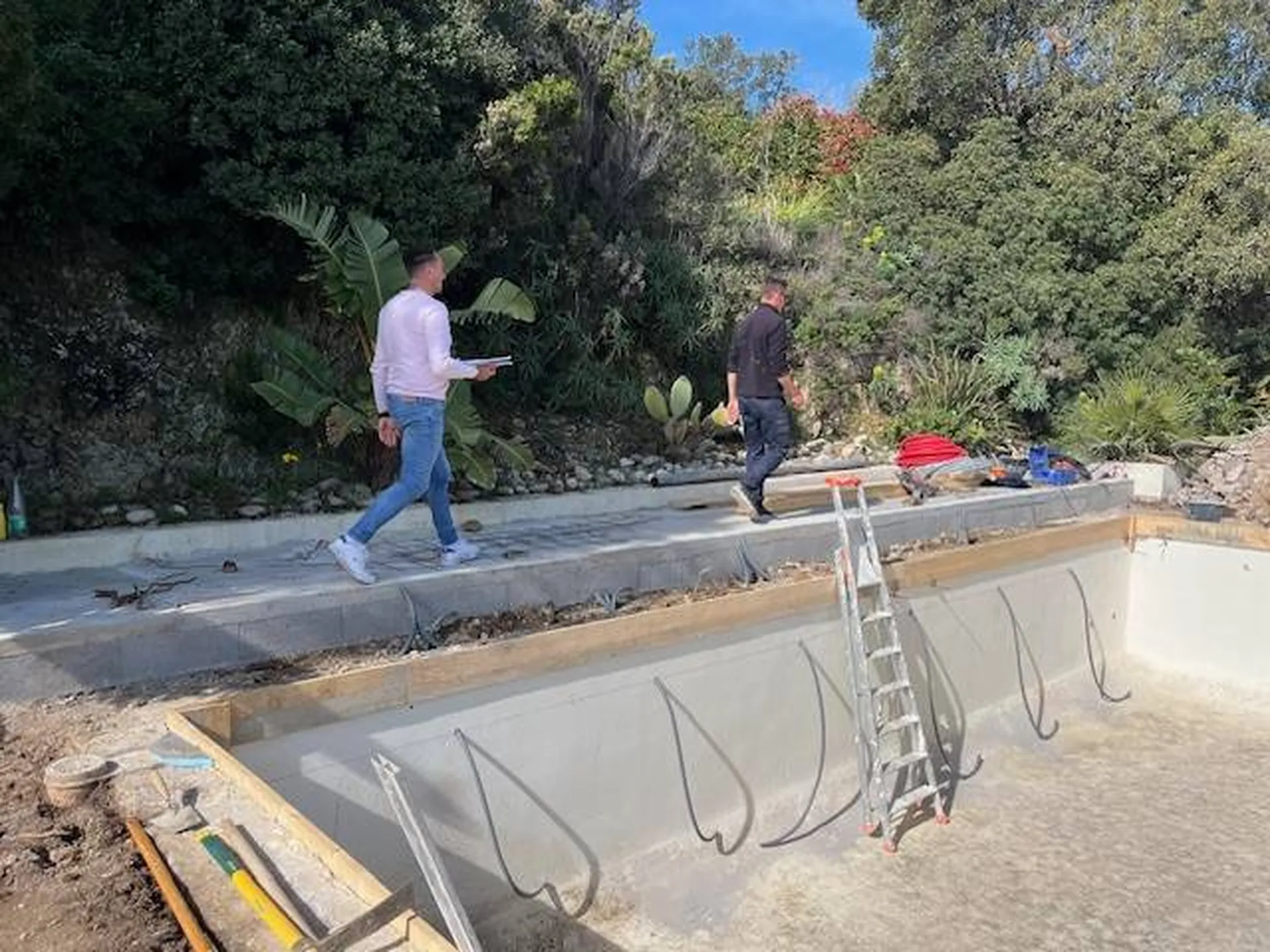 La piscine, initialement vieillissante et nécessitant d'importantes réparations, a fait l’objet d’une transformation totale. Les équipes de Piscines Riviera, spécialisées dans les rénovations haut de gamme, ont utilisé des techniques modernes pour assurer la durabilité et l'esthétique de la piscine. Le revêtement en béton a été complètement refait, permettant une finition lisse et durable. Des matériaux de qualité ont été choisis, offrant non seulement une résistance aux intempéries et à l’usure du temps, mais aussi un design contemporain en harmonie avec l'environnement prestigieux.
